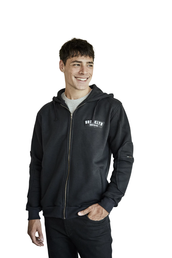 CAMPERA DE FRISA CON CAPUCHA CON REFUERZOS DE KEVLAR INTERNOS EN HOMBROS Y CODOS. INCLUYE PROTECCIONES DE HOMBRO Y CODO. CUENTA CON BOLSILLO PARA ADICIONAR PROTECCION DE ESPALDA -ESTAMPA EN FRENTE Y MANGAS- CIERRES YKK.