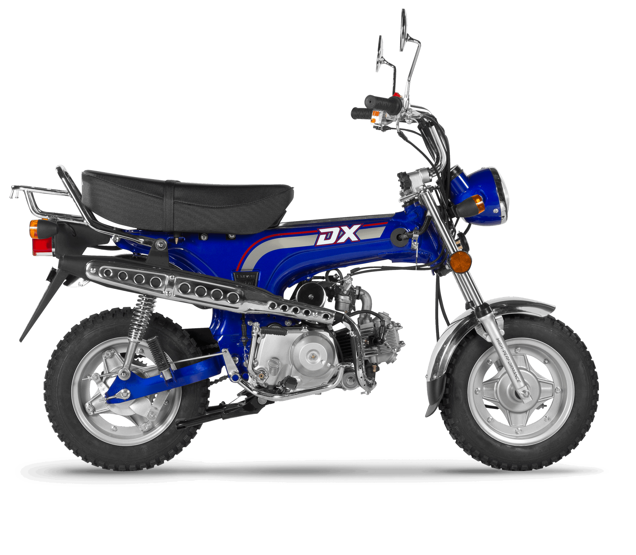 La Corven DX 70 es una mini‑moto tipo Dax con motor monocilíndrico 4 tiempos de 72 cm³, caja de 4 marchas con selectora automática (no tiene manija de embrague) y arranque eléctrico y a pedal.